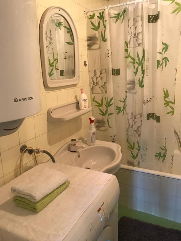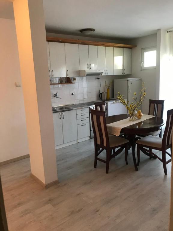 Fitted kitchen appliances and a washing machine are provided for self-catering use throughout the unit. A dining area, sofa bed, and TV are arranged within the living space for resident use. Standard residential furnishings are installed throughout all rooms of the apartment.