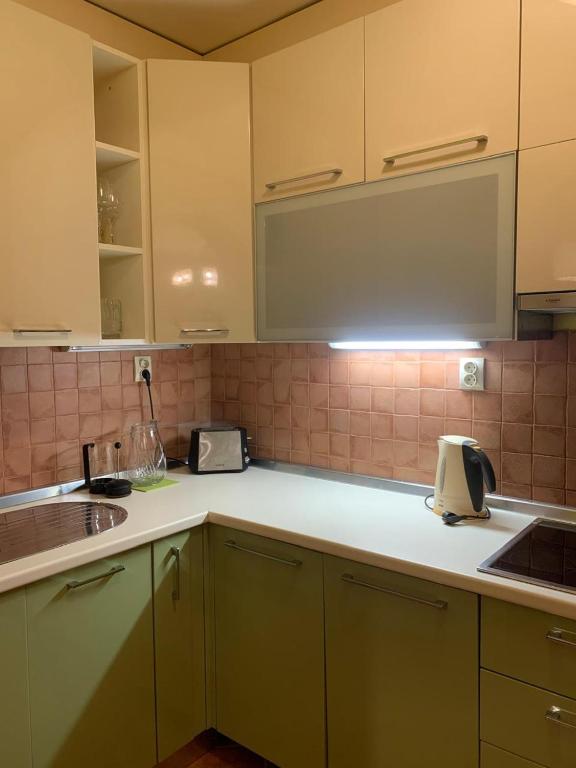 The interior includes a fully equipped kitchen with standard appliances and a washing machine for in-unit laundry. Air conditioning is installed throughout all rooms of the apartment. A TV and standard residential furnishings are provided.