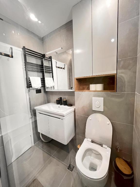 Each kitchen is fully equipped with a dishwasher, oven, and standard appliances for self-catering use. A washing machine and private bathroom with a walk-in shower are provided in every unit. Parquet flooring is installed throughout all rooms of each apartment.