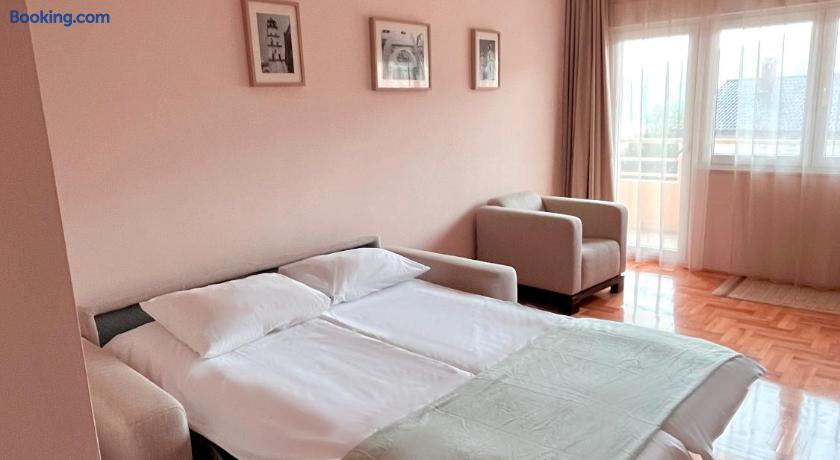 The apartment is equipped with air conditioning and free WiFi. Interior amenities include a fully equipped kitchen with a refrigerator, microwave, and oven, as well as a washing machine. Additional features include a dining table, sofa bed, parquet flooring, and a private bathroom. Pets are permitted.